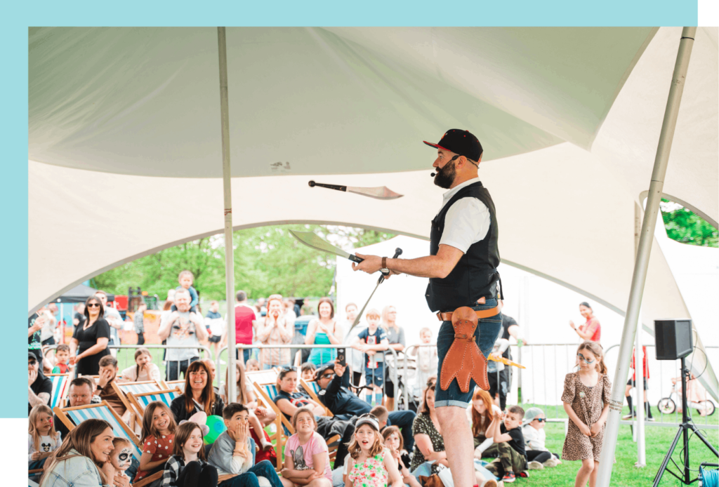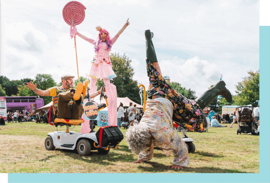 Find wacky roaming comedy darting around site. From French chefs on giant bikes to mobile discos, you’ll be sure to spot them running about!
